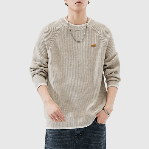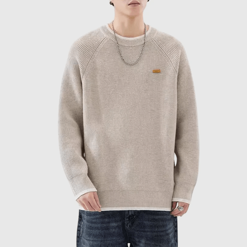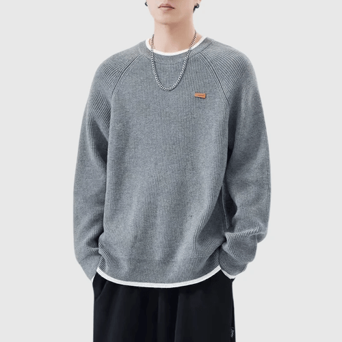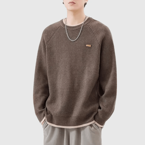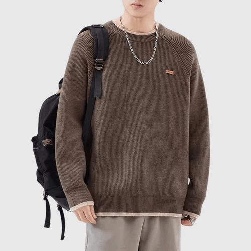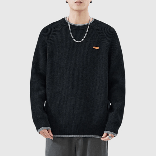 日系幼邊條紋撞色皮革標籤 圓領針織毛衣 [SBK-1099]