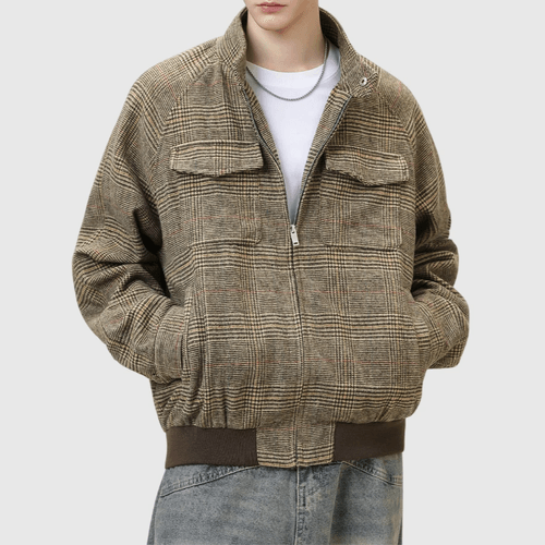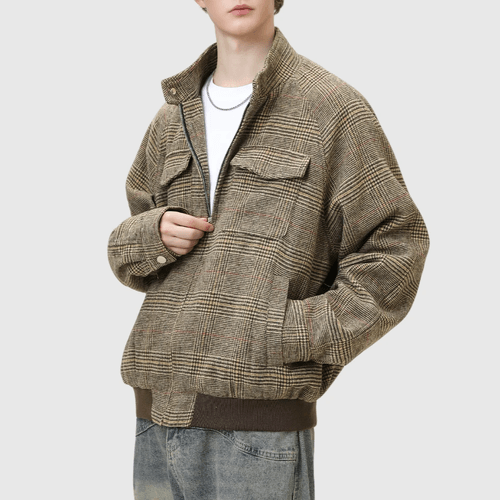 復古雙前袋千鳥格紋紋理 半領長袖外套 [SBO-1408]