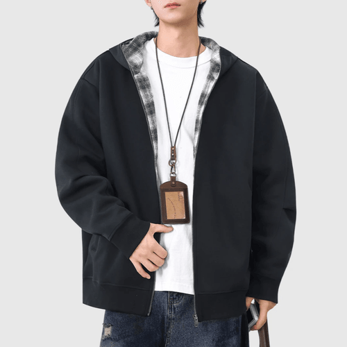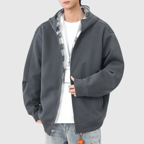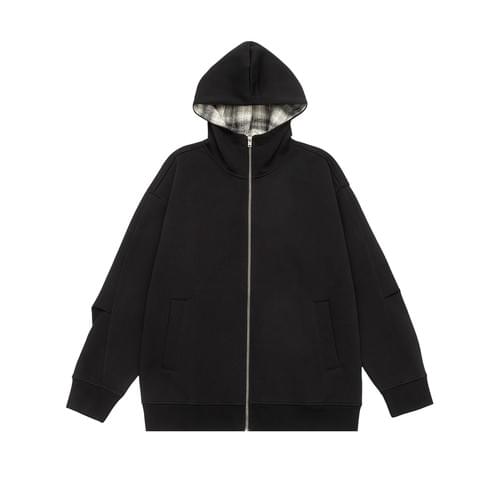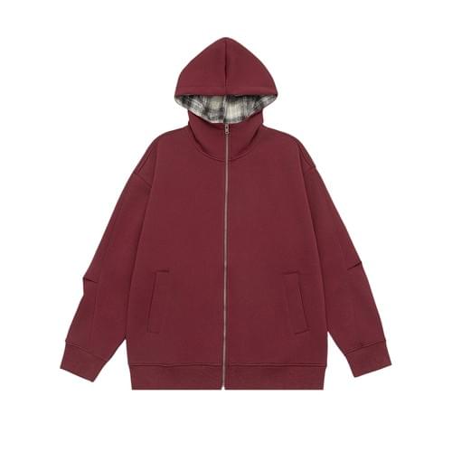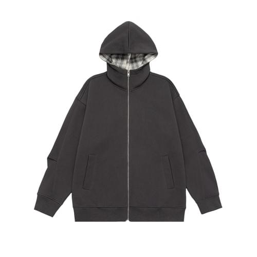 復古內層格仔紋理拼接 連帽拉鍊長袖衛衣外套 [SBO-1426]