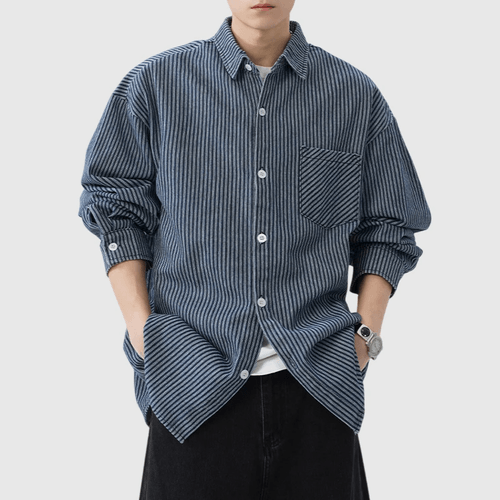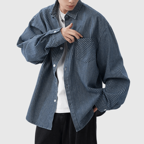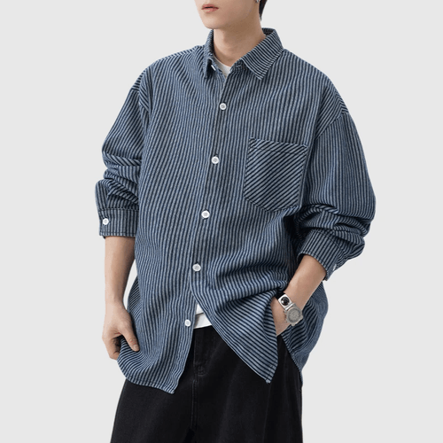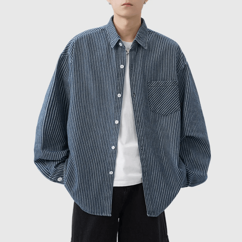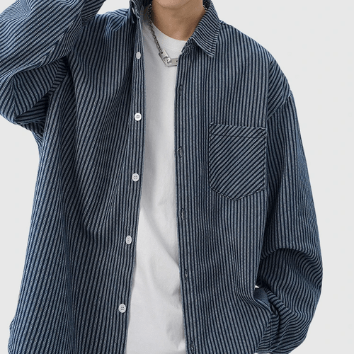 復古洗水牛仔條紋色織 純棉長袖恤衫 [SBS-1216]