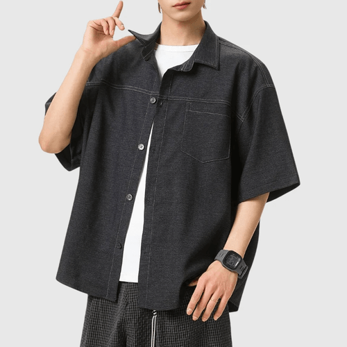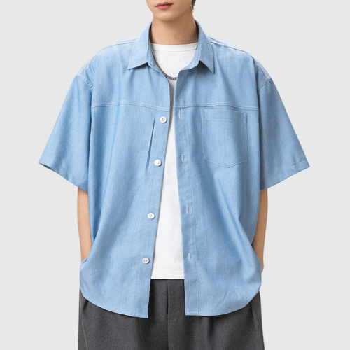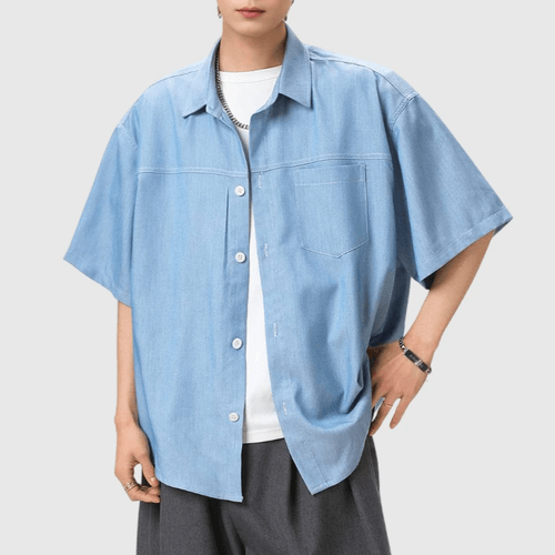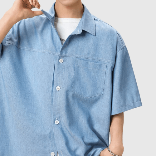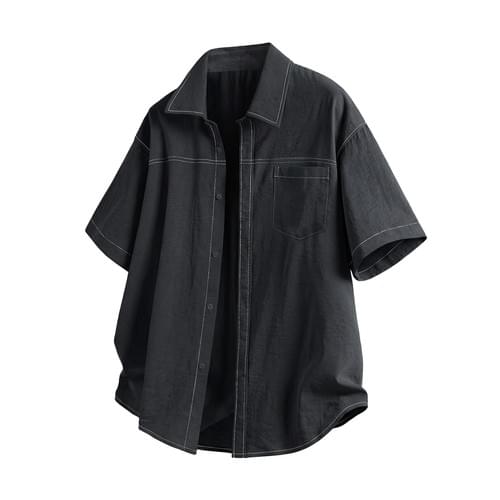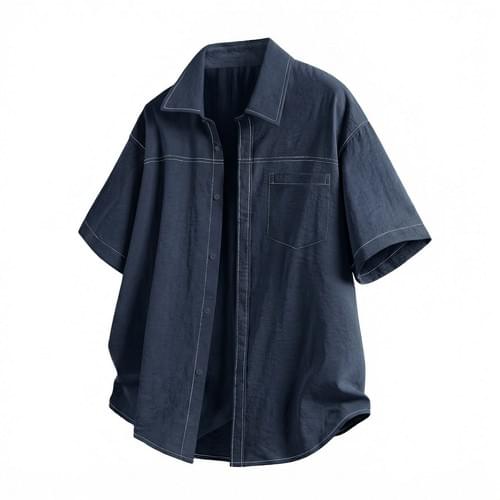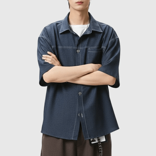 日系水洗撞色輯明線工裝 垂感透氣牛仔短袖恤衫 [SBS-1387]