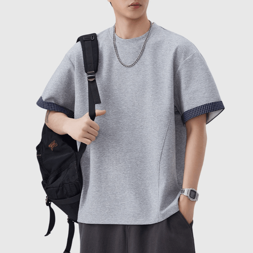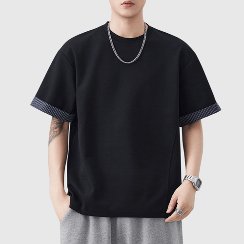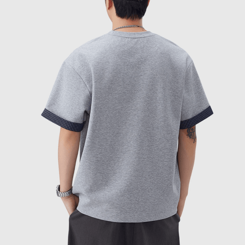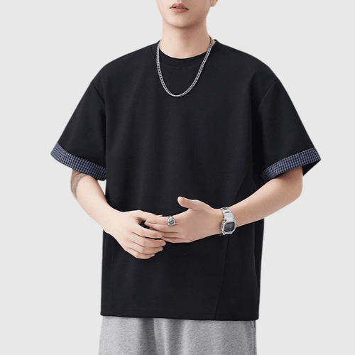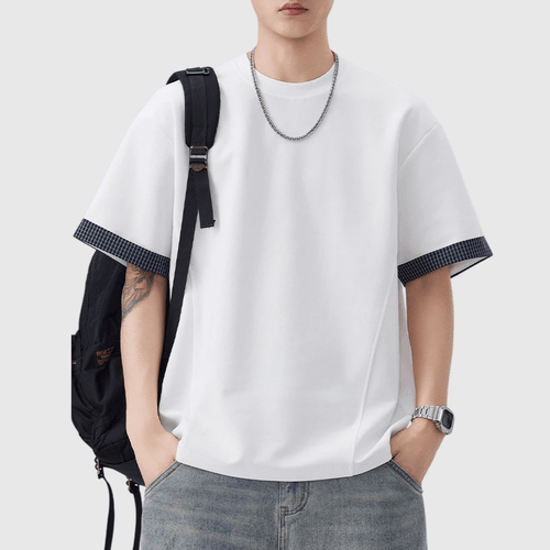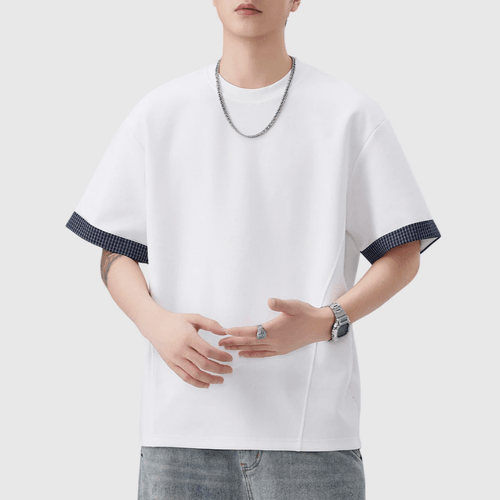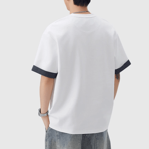 日系手袖格紋縫紉設計 短袖T-Shirt [SBT-1507]