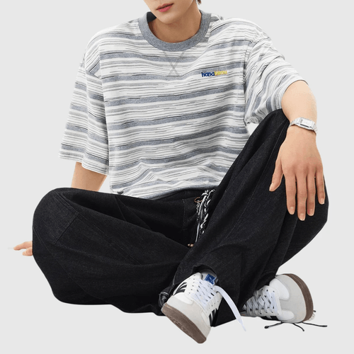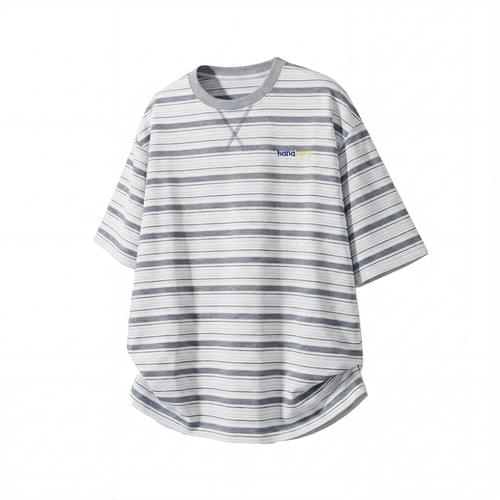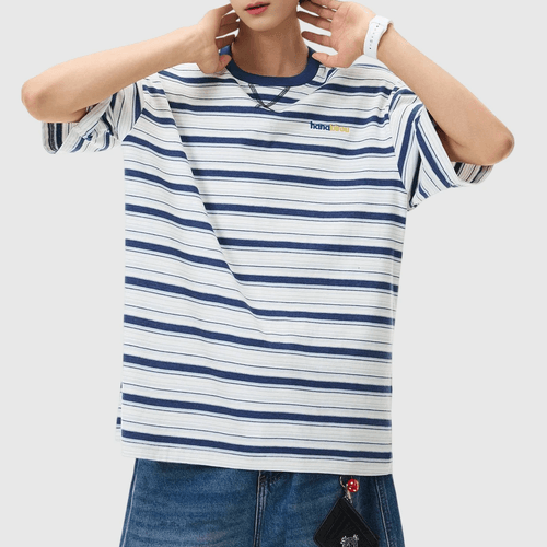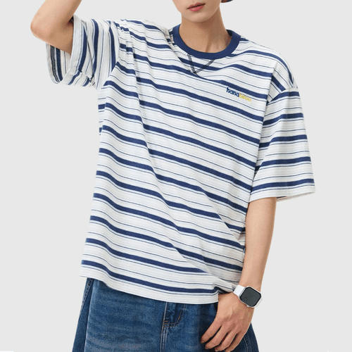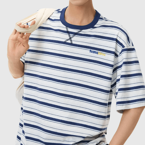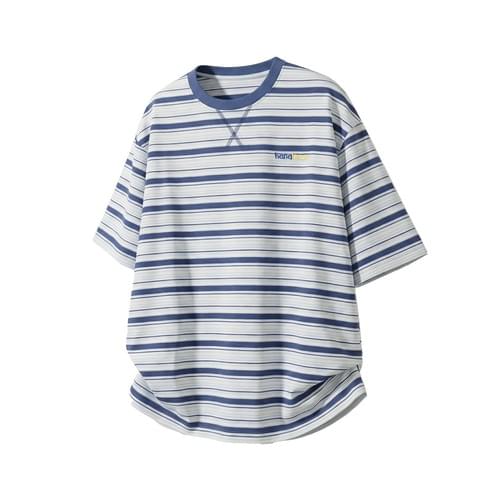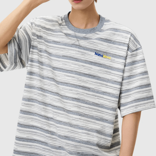 色系條紋撞色色彩細文字刺繡 純棉短袖 T-Shirt [SBT-1556]