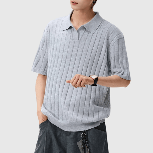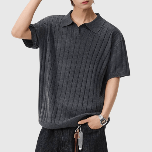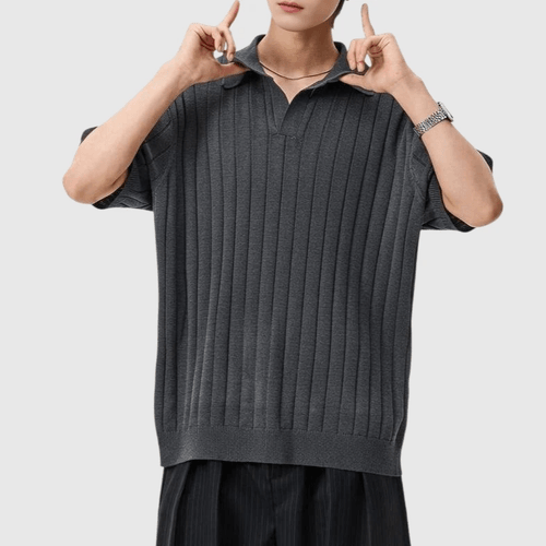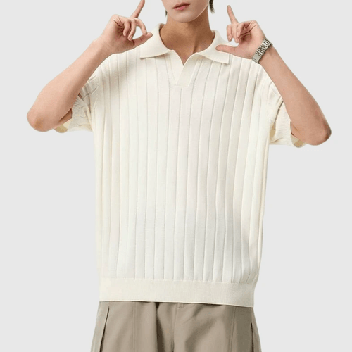 復古垂直肌理紋理 V 領 針織短袖 POLO T-Shirt [SBT-1474]